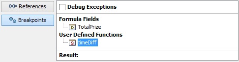The debugger can be used while executing a report as well. Simply set a break point in a formula and a debugger window will pop-up when the break point is hit. Please note that the formula in that window is only for reference, it cannot be modified. The references though can be set here. To prevent the debugger from showing up, please remove all break points.