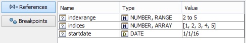 References is the generic term for any variable or field a formula refers to. These references are in most cases the input parameters of a formula and directly correlate with the result. The "References" tab of the debugger shows all variables and fields of the current formula as well as their value type and current value.